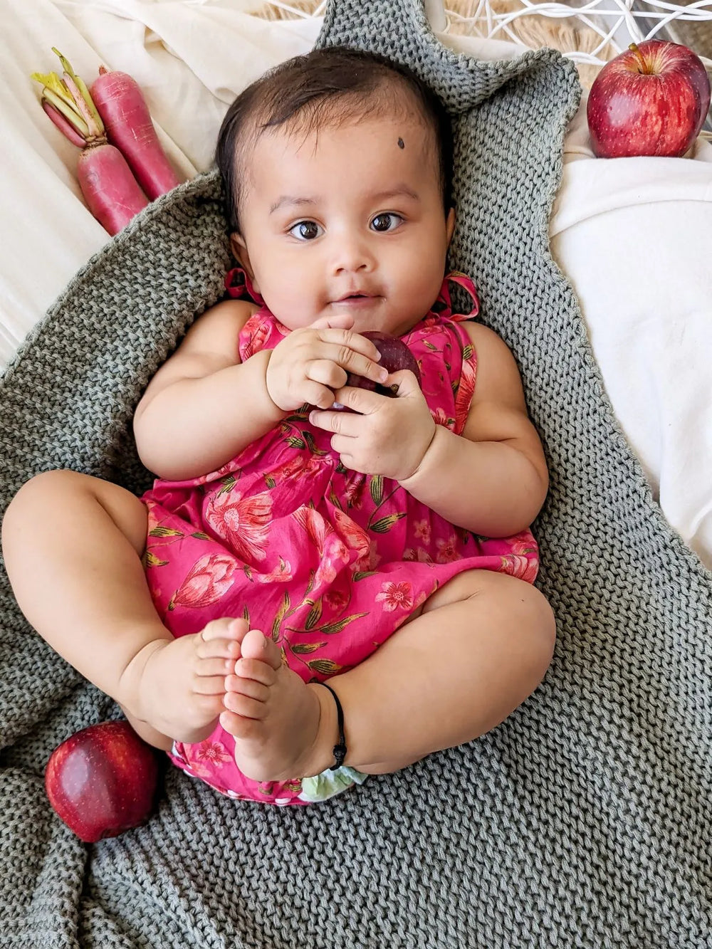 This romper features a tiny yoke for a bit of flair and a baggy body that gives lots of room to move.