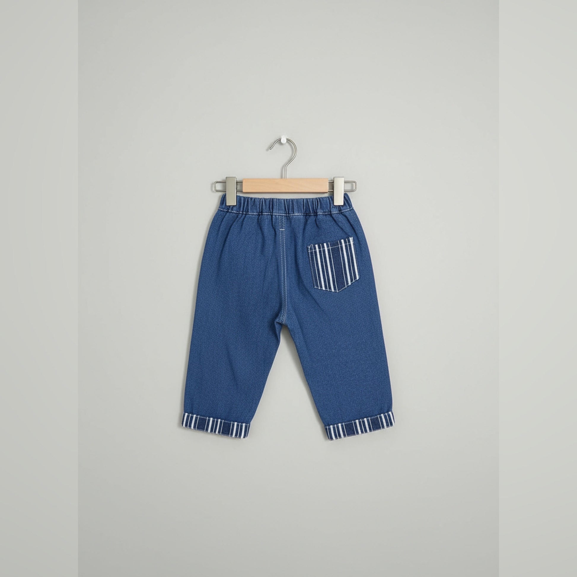 This stylish kids cord set features a denim-inspired look with a unique twist. The full-sleeve shirt showcases a combination of classic solid denim and trendy blue and white vertical stripes, complete with front buttons and a chest pocket for added detail. The matching pants are designed with comfortable denim fabric, accented by striped turn-up cuffs to coordinate perfectly with the shirt. Ideal for playful days and casual outings, this set offers both comfort and standout style for your little one.