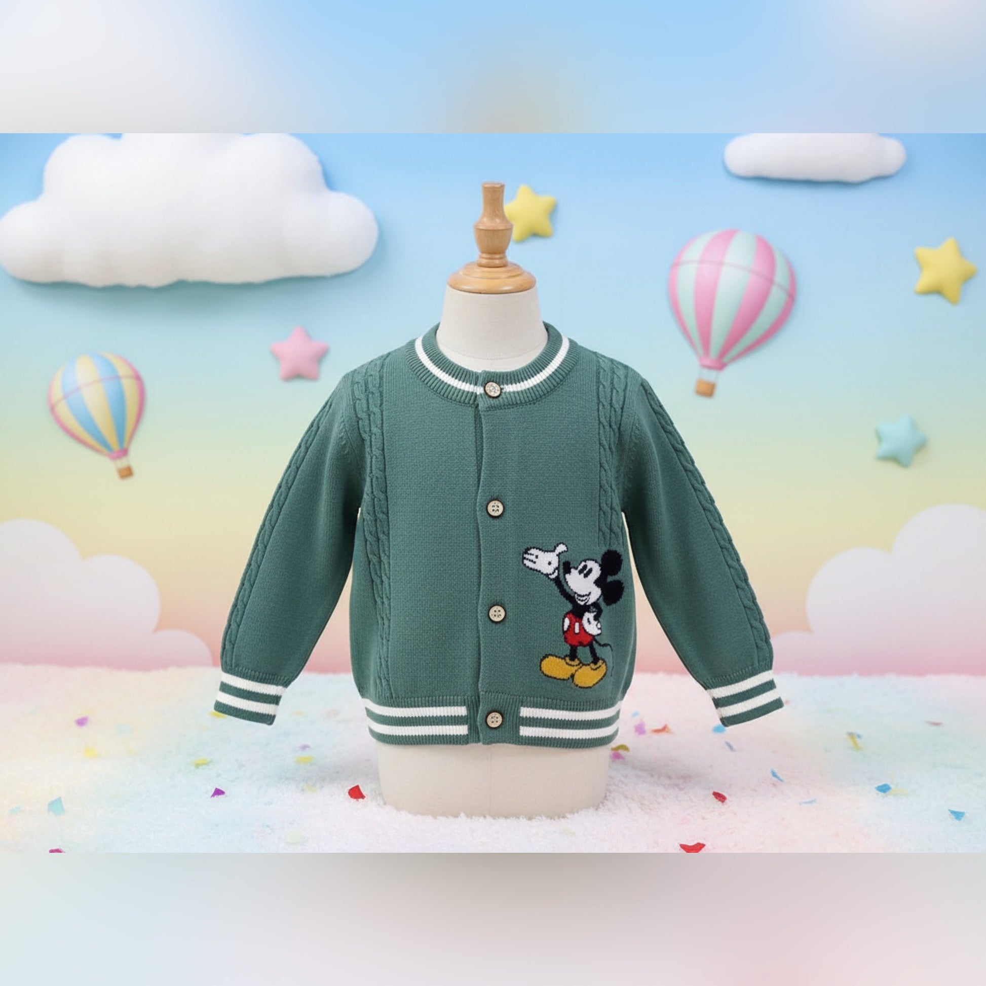 This adorable green knitted cardigan is perfect for kids, featuring a charming Mickey Mouse embroidery on the front. The sweater has a classic cable knit design along the sleeves, secure front buttons, and stylish white striped details on the collar, hem, and cuffs. It’s both cozy and fashionable, making it ideal for any season. The whimsical hot air balloon and cloud background adds a playful touch—perfect for product displays or kids’ fashion shoots.