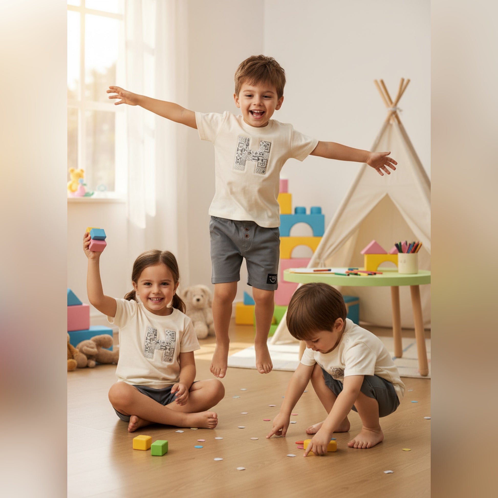 This elegant kids set features a Lemon cotton t-shirt adorned with a bold, patterned letter “H” and convenient shoulder snap buttons for easy wear, paired with classic grey shorts equipped with button accents and a modern patch detail. Perfect for everyday outings or relaxed gatherings, this soft outfit combines chic minimalism with durability and comfort, making it ideal for active little ones